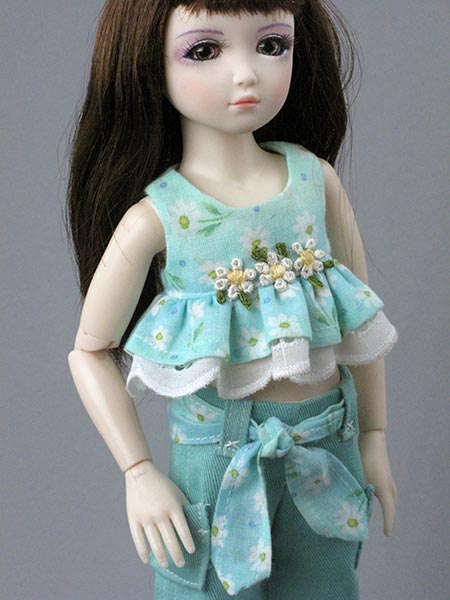 Lia is wearing a crop top with eyelet ruffle and purchased embroidered applique. The top is sewn up in a printed lightweight cotton.