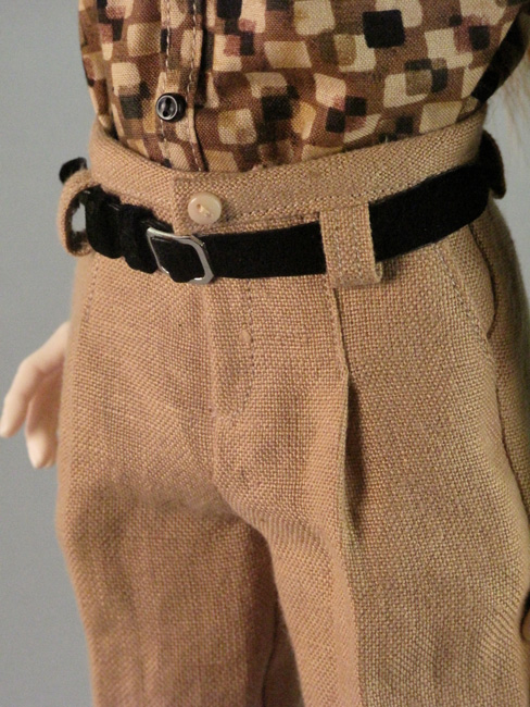 His trousers are made of a lightweight linen and have a natural waistline with dropped belt loops. The front is also pleated with a faux fly opening.