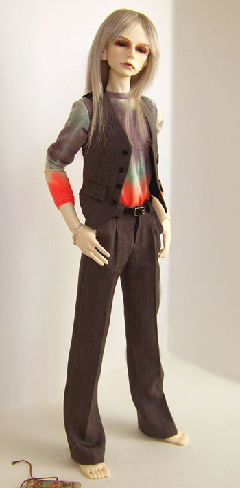 They call him Hollywood at the clubs. He likes to look good. He is wearing a matching waistcoat and trousers of wool suiting in deep gray. The relaxed fit slouchy trousers have front pleats and side seam pockets. They are a little long so they break at the foot. The fitted waistcoat is lined and has faux pockets and top welt pocket. It buttons with four 1/8 inch buttons.