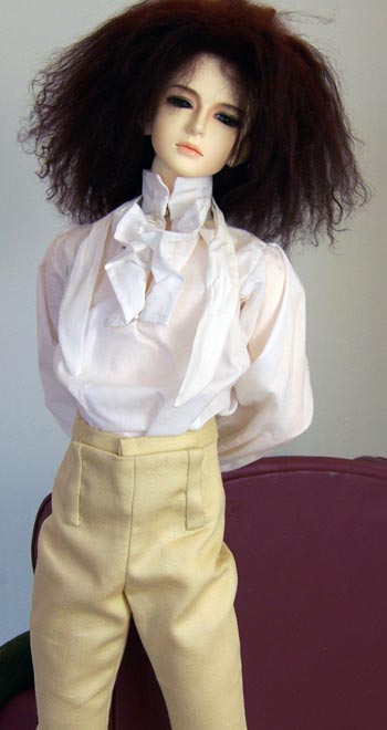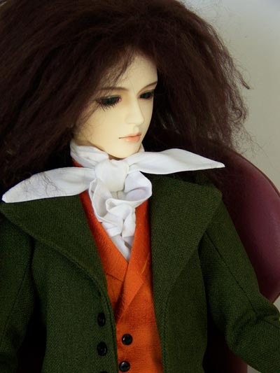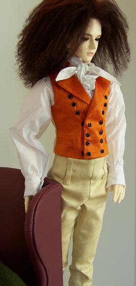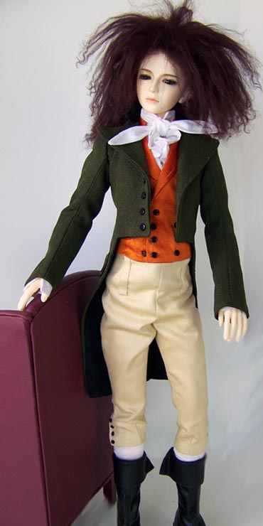 He is always classic in style. This pattern is taken from the styles of 1795. This traditional ridding outfit has tail coat, sleeveless waistcoat, fall front breeches and full dress shirt.