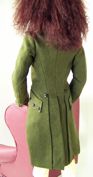 The jacket is made front a lightweight wool suiting with velveteen collar. It has faux side pockets, pleated side seams and split tail back. The waistcoat is made of silk and is double breasted with stand collar and faux welt pockets.The back belt laces.