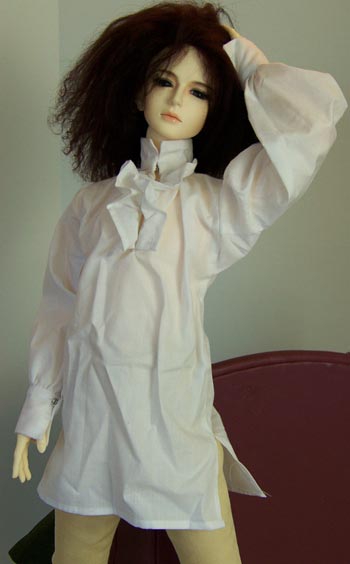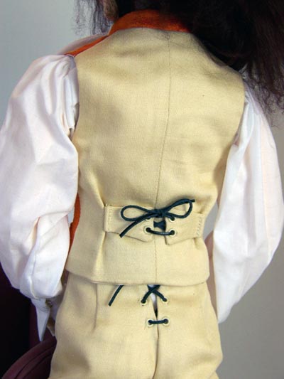 His breeches are made from a cotton twill and have the fall front and laced up back true to the period. He shirt is of fine cotton shirting and has a ruffle front.