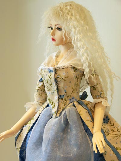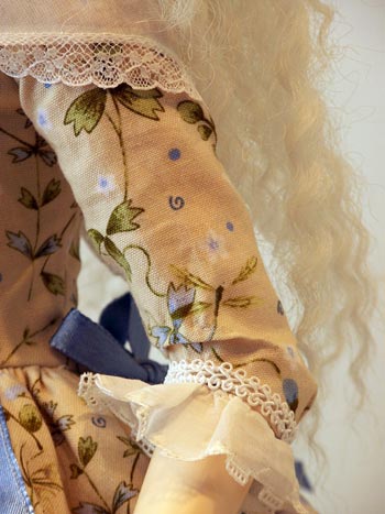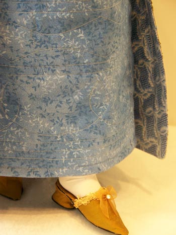 Her outfit consists of lined open gown, with ribbon on the skirt. Eyelet and French gimp trim on the bodice and sleeves. The petticoat or skirt is quilted.