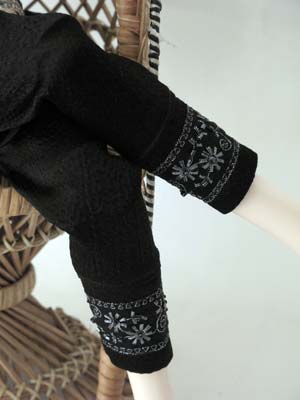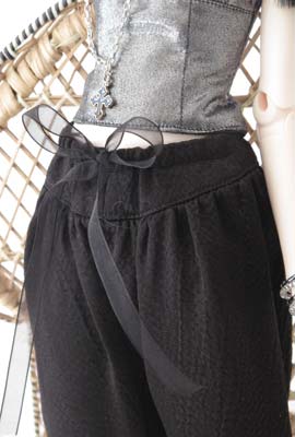 Her pants are all the rage, Indian influence and copied from a pair I bought in India, they are gathered on to a yoke with organza ribbon tie. The pants have cuffs that are trimmed in beaded and embroidered organza ribbon.