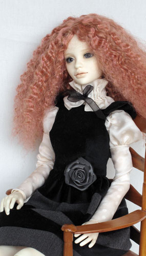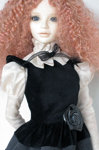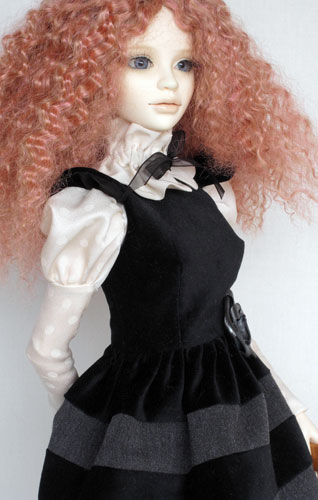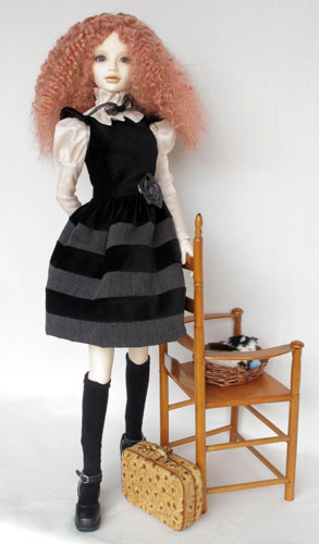 Cocori is enchanting in her jumper and blouse. This fairy tail jumper/dress is made in velveteen and wool. The winged bodice of the jumper is fully lined and it snaps at the center back. The jumper skirt is pieced with alternating velveteen and wool stripes and trimmed with a purchased rosette.