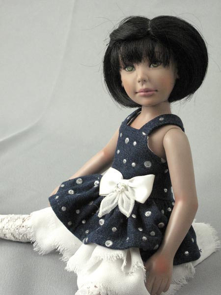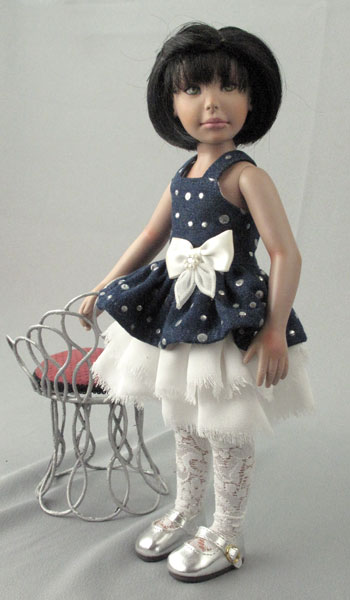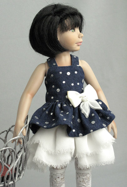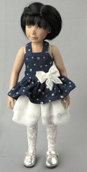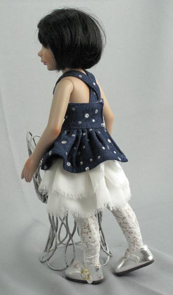 This is a fun party dress it looks like a skirt and top. The top is lightweight denim, with shoulder straps that cross at the center back. The bodice has a natural waistline ending in a matching ruffle peplum.