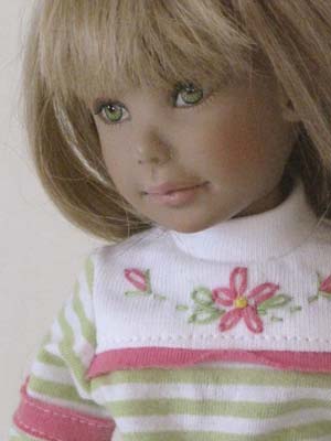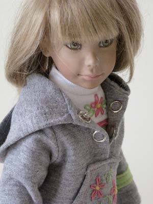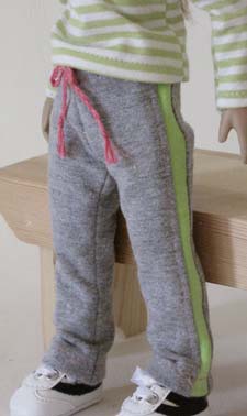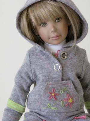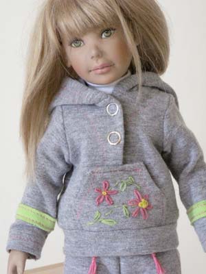 Everyone needs some playtime, and Leeann is all set in her cotton/Lycra jogging suit. The pants have a draw string waist with color blocked side insets. Her hoody has a placket front with snaps, sleeves with color blocked bands and a waistband finishes the bottom. The front has a kangaroo pocket trimmed with hand embroidery to coordinate with the pants and top.