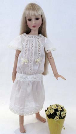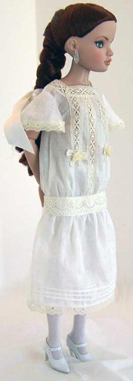 Made of cotton batiste, with insertion lace trim, the dress has a dropped waist, butterfly sleeves and a gathered skirt. Hand made linen ribbon rosettes trim the bodice while pin tucks trim the skirt.