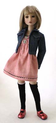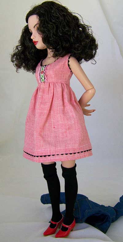 The baby doll dress is trimmed out in layers ribbon and ruffled ribbon down the center front. Note the front bodice is shorter than the back bodice which is just above the waist. The armholes, neckline and hem tuck is trimmed in baby rickrack. This dress snaps in the back.