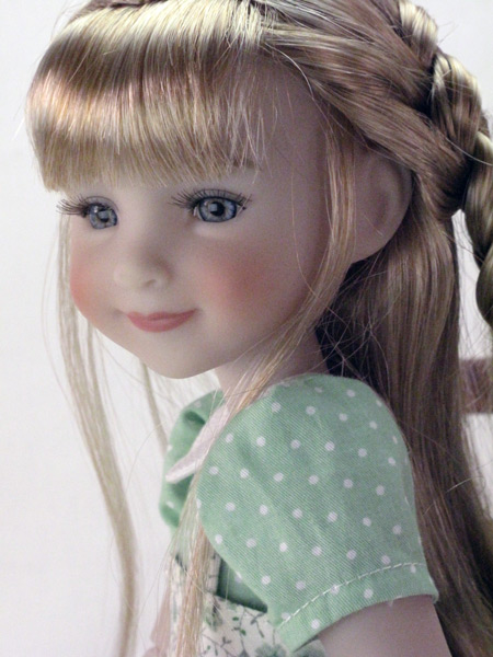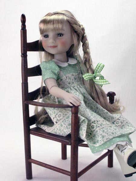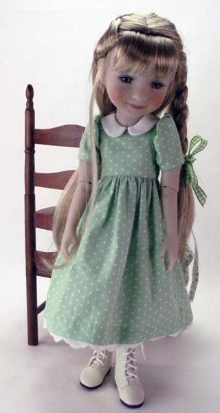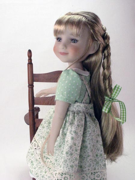 Sarah’s pinafore or pinny over her dress has a shaped top yoke and back snapped straps. The skirt of her pinny has a lace inset.