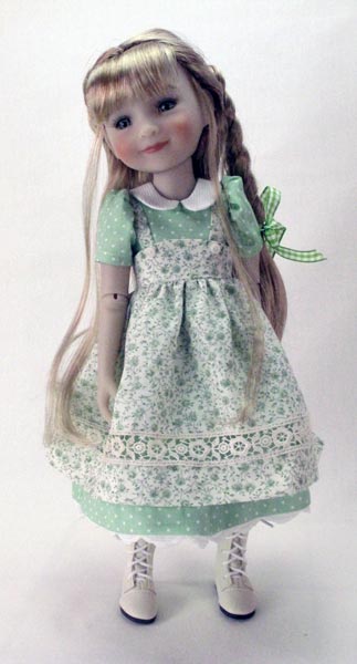 Sarah is wearing a dress and pinny in cotton calico. Her dress has gathered skirt and sleeve caps. the skirt of her dress has a flanged hem with eyelet lace. It snaps down the back.