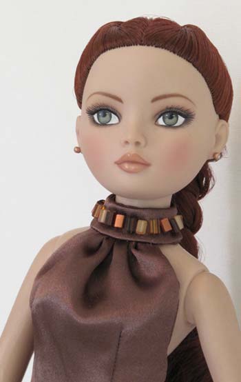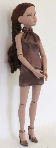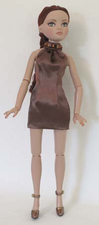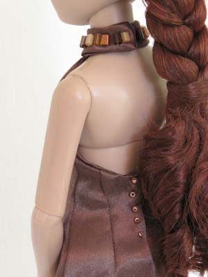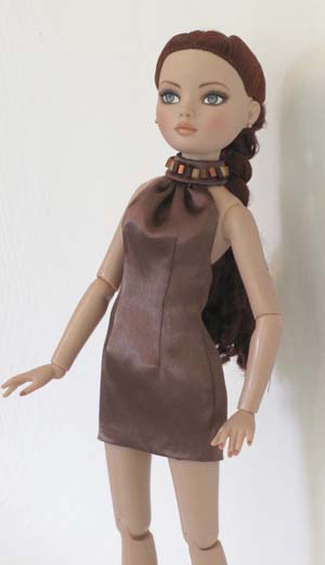 This is a fun little cocktail dress that could be modified many different ways. I made it in copper satin and used copper, brown, ivory and gold beads to trim the collar. The dress opens in the back, and I used mini copper beads as buttons.