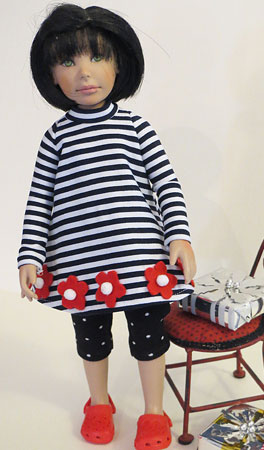 Leeann is wearing a jersey dress, trimmed with felt flowers. The dress has mock turtle neck and long sleeves with a center back opening. She is also wearing a pair of jersey leggings to keep her warm.